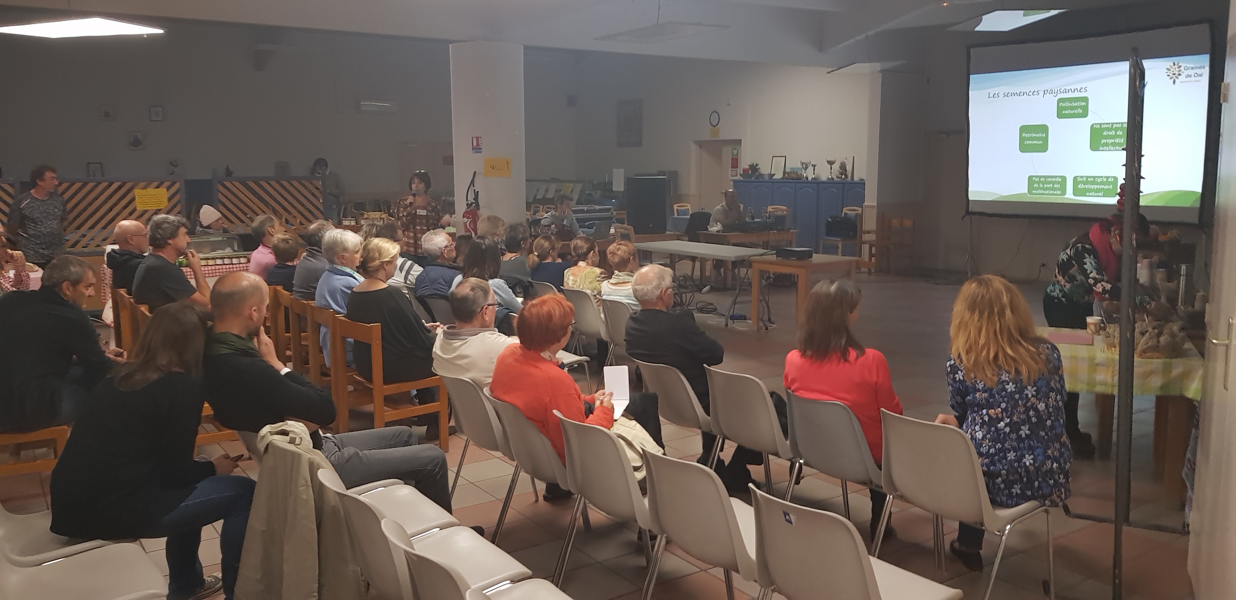 Durant l’après-midi, Carole et Barbara, présidente et secrétaire de l’association, ont déroulé , à un rythme soutenu et, dans une ambiance positive et dynamique, un programme allant du global (la planète) au local ( le territoire), mêlant conférence sur la biodiversité menacée et les enjeux de la préservation des graines, la diffusion du documentaire de Christophe Guyon « La semence dans tous ses états » et l’intervention de Thierry Seren, paysan-boulanger à St Julien les Martigues.